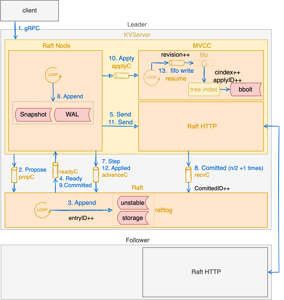 - MVCC 模块异步 将数据应用(apply)到本地存储(步骤 13),并通知 KVServer。