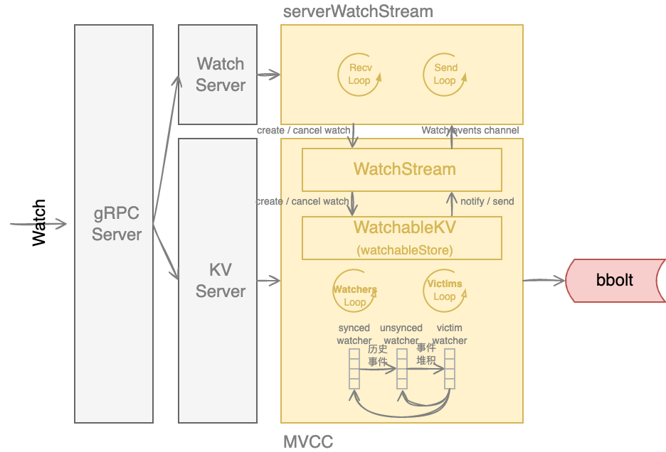 - 当 Client 发起一个 watch key 请求的时候,etcd 的 WatchServer 收到 watch 请求后,会创建一个 serverWatchStream, 它负责接收 client 的 gRPC Stream 的 create/cancel watcher 请求 (recvLoop goroutine),并将从 MVCC 模块接收的 Watch 事件转发给 client(sendLoop goroutine)。