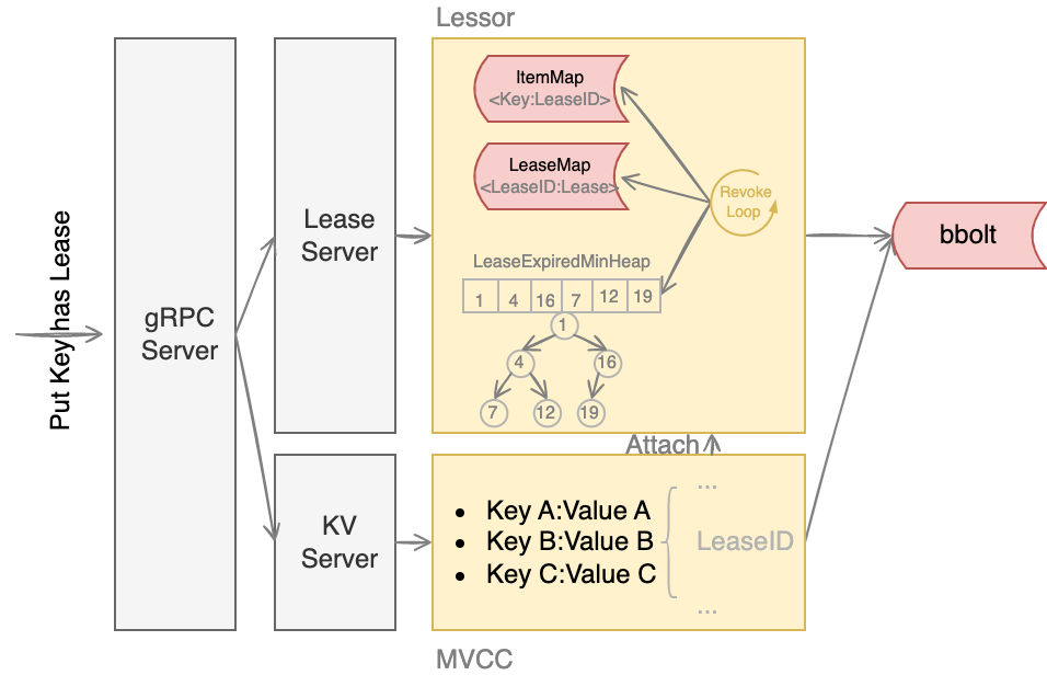 - 当用户新增一个带 租约的 Key 时,MVCC 模块它会通过 Lessor 模块的 Attach 方法,将 key 关联到 Lease 的 key 内存集合 ItemMap。