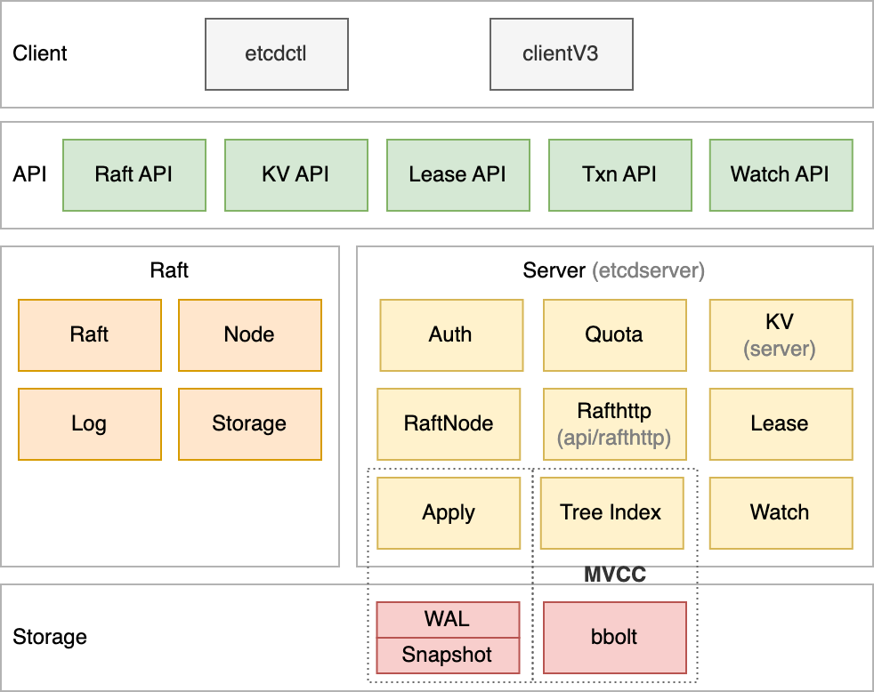 - 包括:Auth 鉴权模块、Quota 配额模块、KV 模块、Raftnode 一致性模块、Rafthttp 一致性通信模块、Lease 租约模块、Apply 持久化应用模块、MVCC 多版本并发控制模块、Watch 变更通知模块等